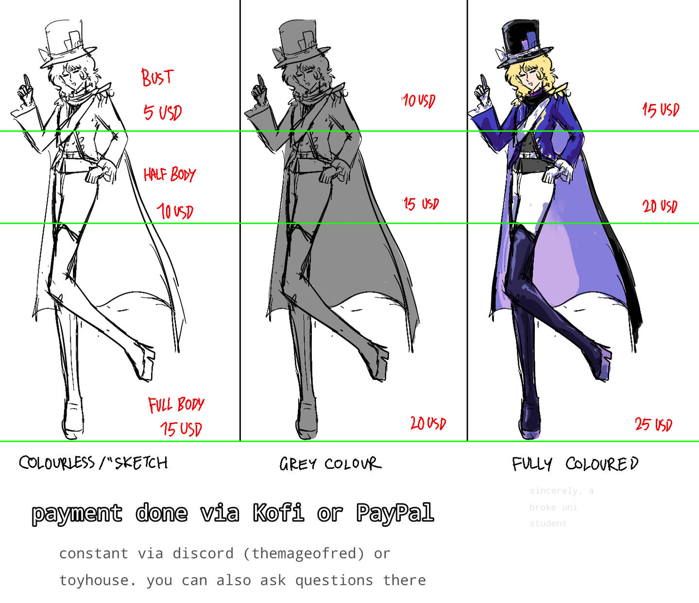 (NOTE THE DISCORD USER IS OUTDATED MY BAD)unfortunately due to life and problems i cant get a job because im an animation student so i open commissionsthese cost 5 usd or more, you might think thats too cheap until you find out thats like rm21 in my country (and you can even pay more :eyes:)so if you wanna commission me, thanks! and if you dont, thats fine